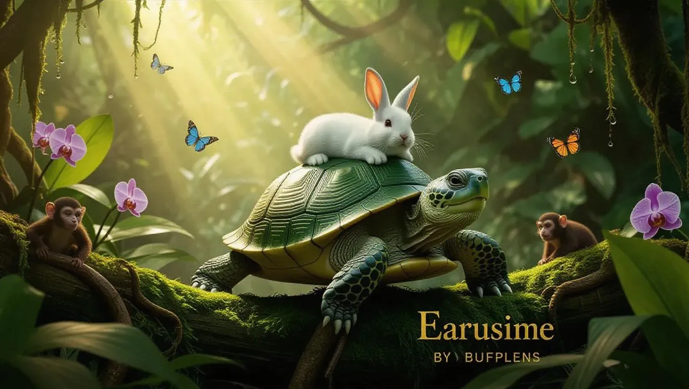 AI-generated cartoon image of an emerald-green turtle trekking through a magical jungle, adorned with a polished shell and carrying a mischievous white rabbit. Hyper-detailed vector art style combines bright orange accents, lush jade tones, and soft bokeh in a full-body magical realism scene. Sunlit ferns, butterflies, and curious monkeys enrich this whimsical, happy illustration of perseverance meeting playful whimsy.