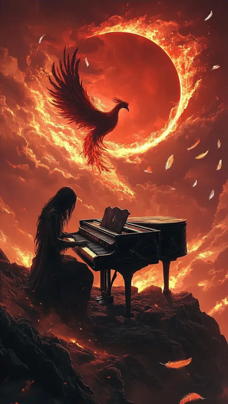 Create AI-generated apocalyptic art featuring a crimson eclipse, an obsidian and bone piano, and a phoenix-shaped cloud. Transform text into visuals of dark warmth and tragic transcendence with vivago.ai's AI image generation tools for professional, surreal results.