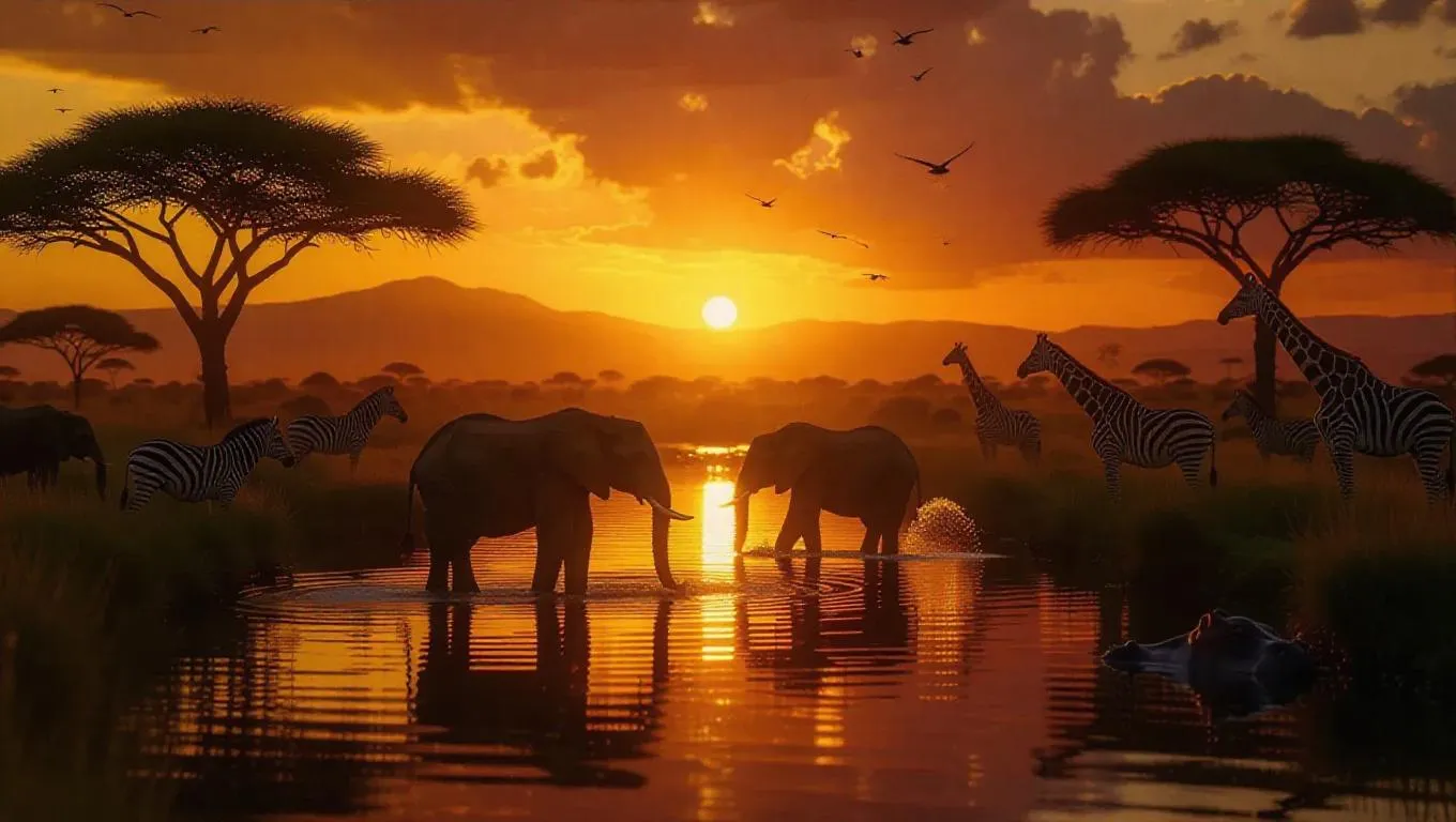 Vivid AI-generated wildlife photography of a golden African savanna sunset: elephants spraying water, zebras grazing, giraffes drinking by a winding river. Hyper-detailed textures, cinematic wide-angle scene with acacia trees, distant mountains, and airborne dust. Serene ecosystem harmony captured in soft bokeh—hippos, soaring birds, and lush reflections enhance this untamed, cinematic moment. Ideal for nature-themed visuals.