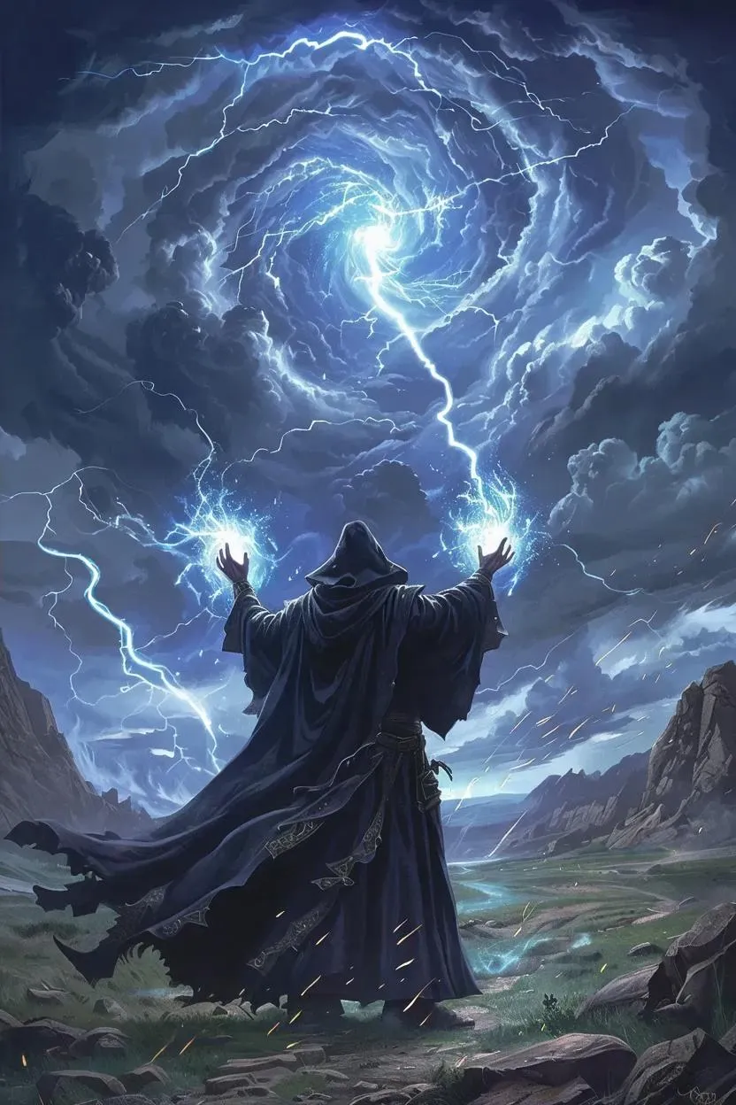 Generate dramatic AI-powered visuals of a wizard summoning a destructive dark magic storm with swirling dark clouds. Transform text prompts into dynamic, professional-grade imagery using Vivago.ai's advanced AI effects and creative tools.