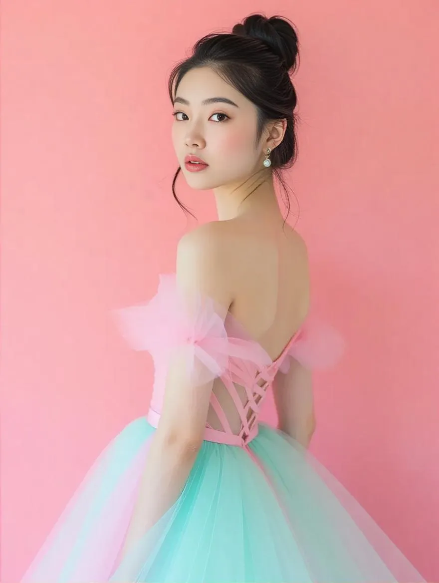 This image is a high-resolution photograph featuring a young East Asian woman posing against a soft, pastel pink background. The East Asian woman is standing with her back to the camera, facing to her left, her head turned slightly to the right. She has a fair skin tone and her dark hair is styled in a neat, high bun. Her makeup is elegant, with a subtle pink lip color and light eye makeup that highlights her almond-shaped eyes. She is wearing a striking, one-shoulder gown made of sheer, layered tulle fabric in pastel shades of pink, green, and blue. The dress has a fitted bodice that transitions into a voluminous, tiered skirt, giving it a light and airy appearance. The shoulder strap is delicate and transparent, adding to the ethereal quality of the dress. Her right hand rests gently on her hip, while her left hand is placed on her thigh, showcasing a simple, elegant ring on her finger. The background is a solid, light pink color, which complements the pastel hues of her dress and