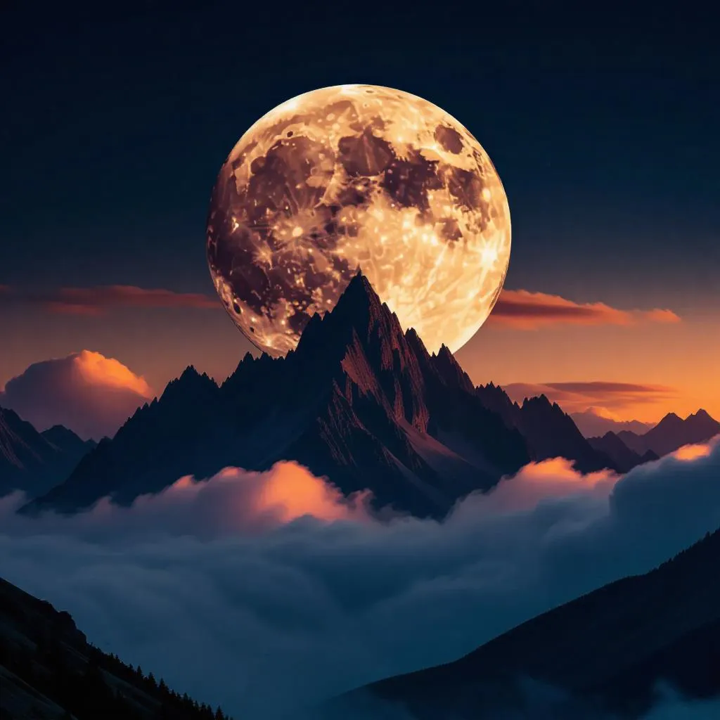Create a mesmerizing moonlit landscape with a vivid orange moon, textured craters, and mist-shrouded jagged mountains. Generate warm, ethereal AI imagery featuring celestial skies, foggy valleys, and atmospheric depth using vivago.ai's advanced tools for professional-grade nightscapes and dreamy visual storytelling.