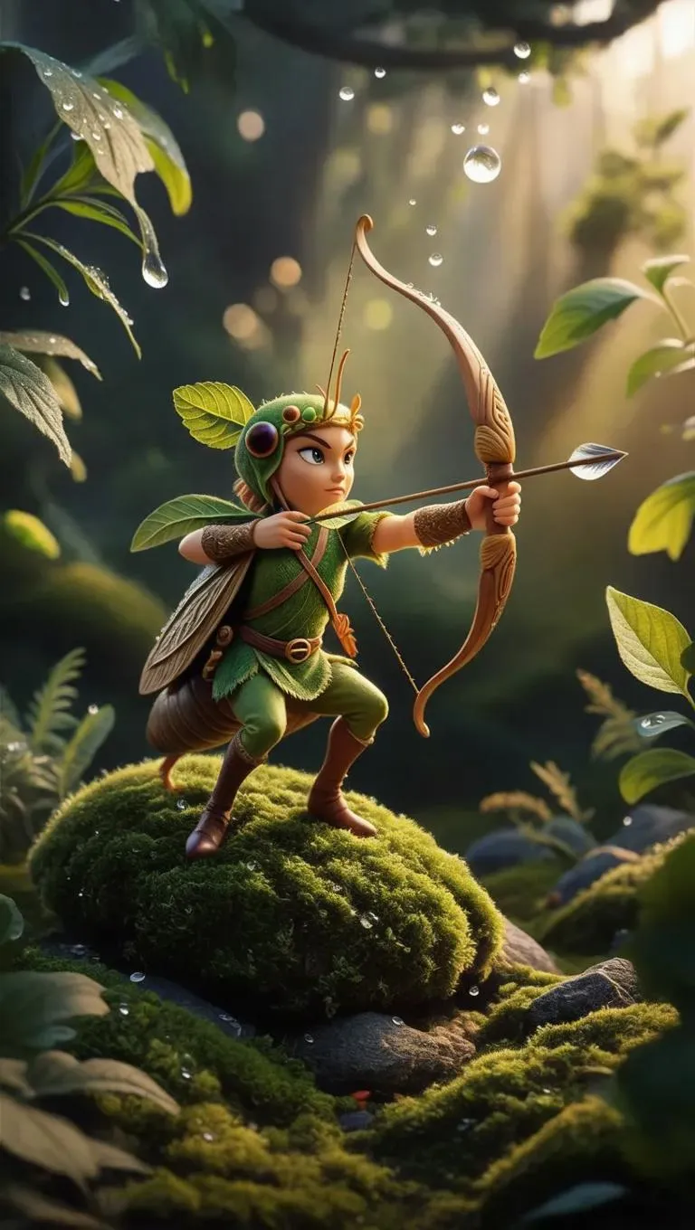 Create hyper-realistic AI-generated micro photography of a fantasy archer: tiny forest-green-clad figure with a leaf crown rides a textured grasshopper across moss, aiming a wooden bow at a dewdrop target. Soft diffused sunlight highlights intricate nature details—grasshopper legs, dappled foliage, and whimsical adventure in this magical, miniature woodland scene.