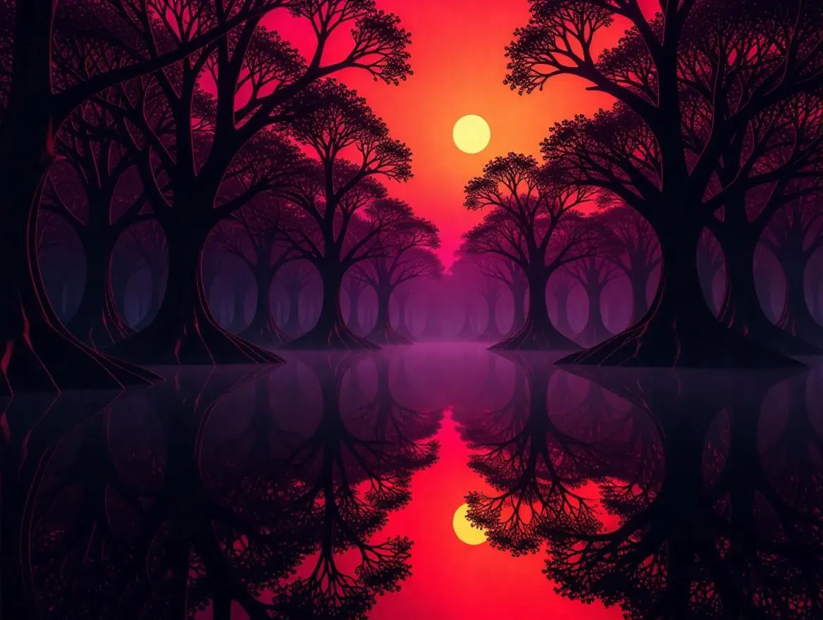 Transform your vision into AI-generated art with a surreal forest of bioluminescent crystalline trees, geometric branches, and a mirror-like lake under a crimson sky. Create dreamlike landscapes effortlessly using VivaGo.ai's AI image generator for mesmerizing, professional-grade surreal scenery.