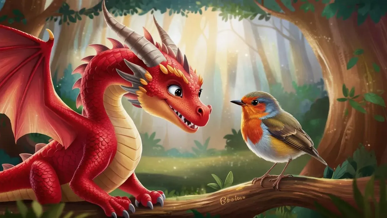 Create enchanting AI-generated art of a playful red dragon and curious robin bird bonding in a whimsical scene. Explore fantasy creature designs, vivid visuals, and storybook charm with VivaGo's AI tools for eye-catching, imaginative content.