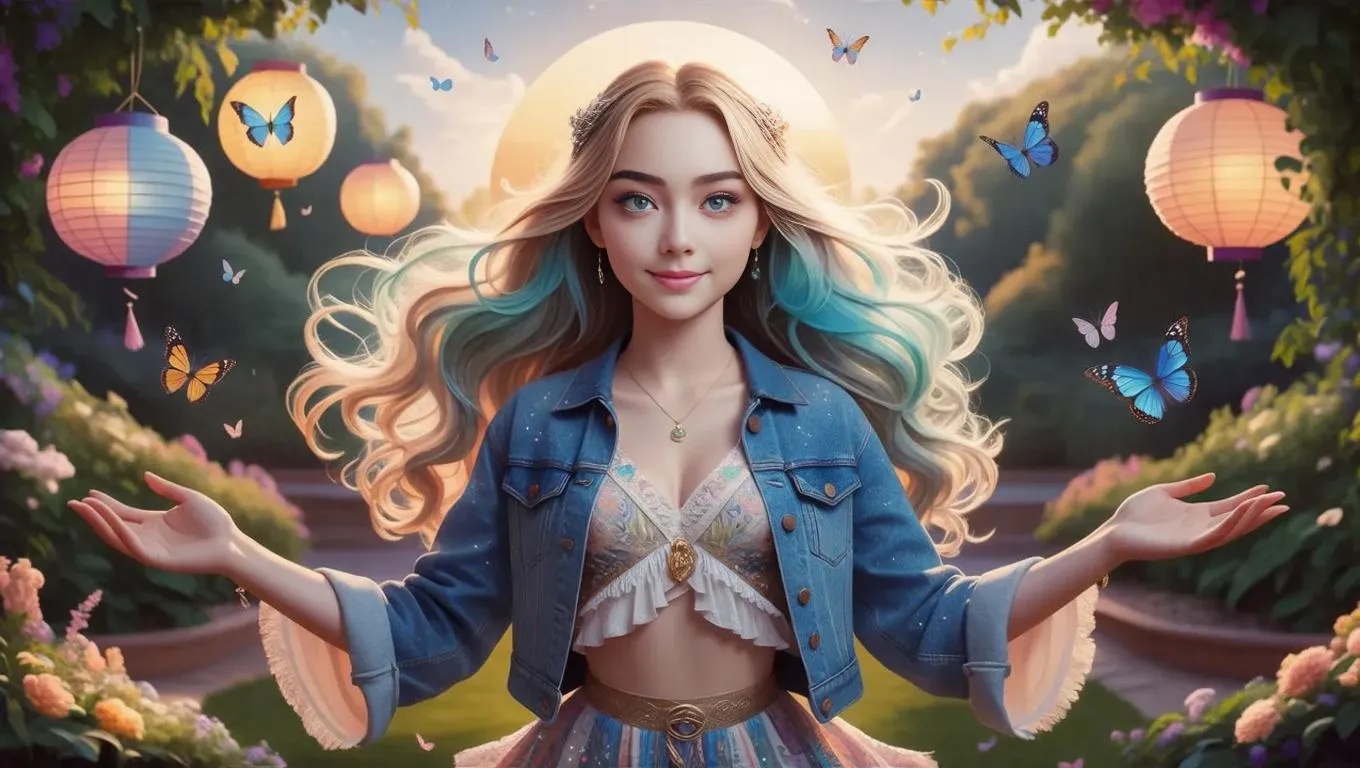 Create vibrant Gemini-inspired portraits with vivago.ai's AI image generator. Design a whimsical garden scene featuring a dual-haired woman in bohemian style, blending electric blue and blonde locks with celestial-patterned denim. Our AI tools transform text prompts into airy, magical visuals – perfect for crafting ethereal characters surrounded by butterflies and floating lanterns. Professional editing meets creative freedom.