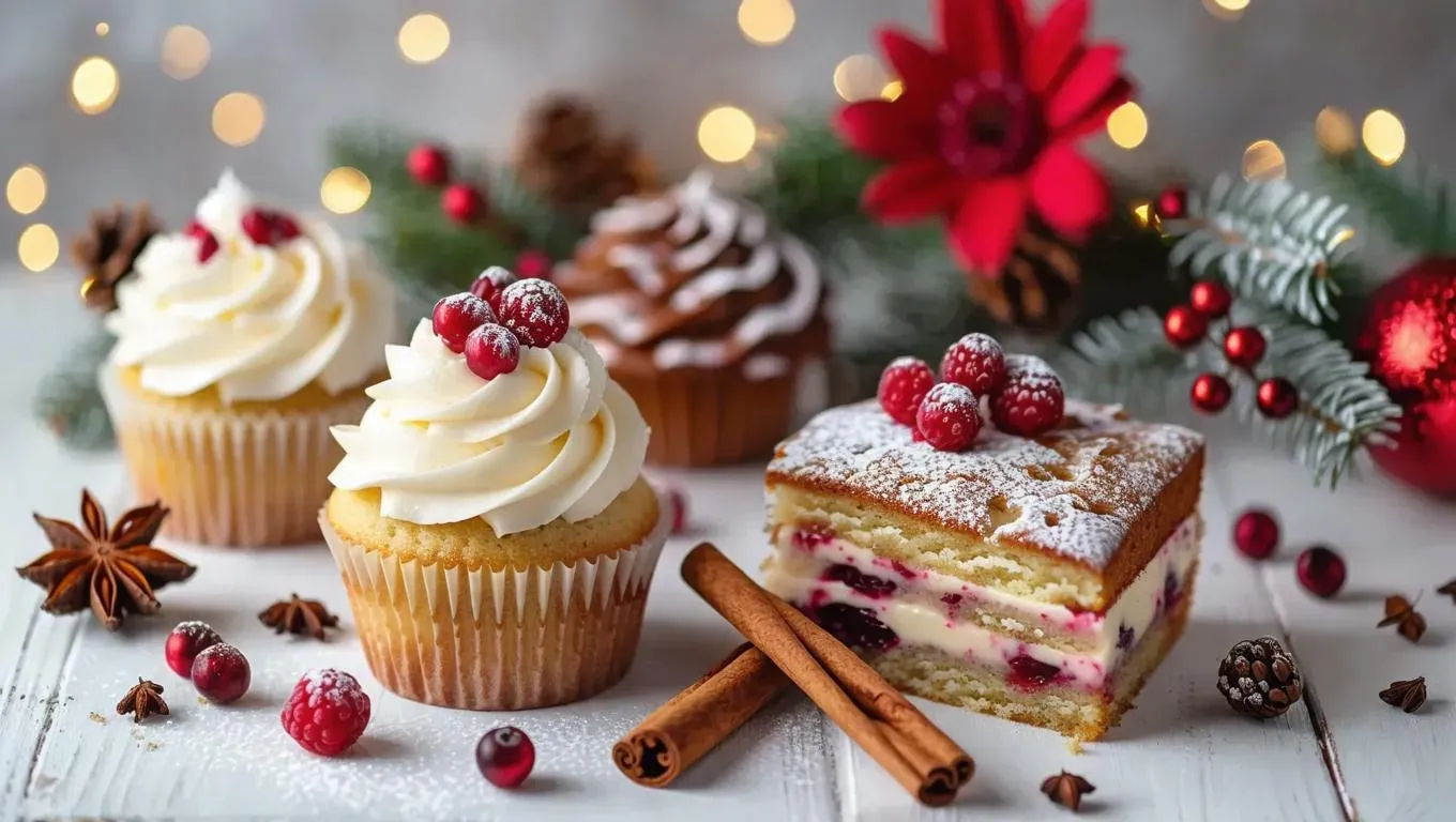 Festive holiday dessert scene: AI-generated image with detailed cupcakes, cinnamon sticks, and layered cake adorned with red berries, holly leaves, and vibrant flowers. Realistic coffee cups, elegant saucers, and warm white background create a cozy, celebratory vibe. Perfect for holiday branding, social media, or greeting cards. Explore AI-powered creativity for stunning, professional-grade visuals.