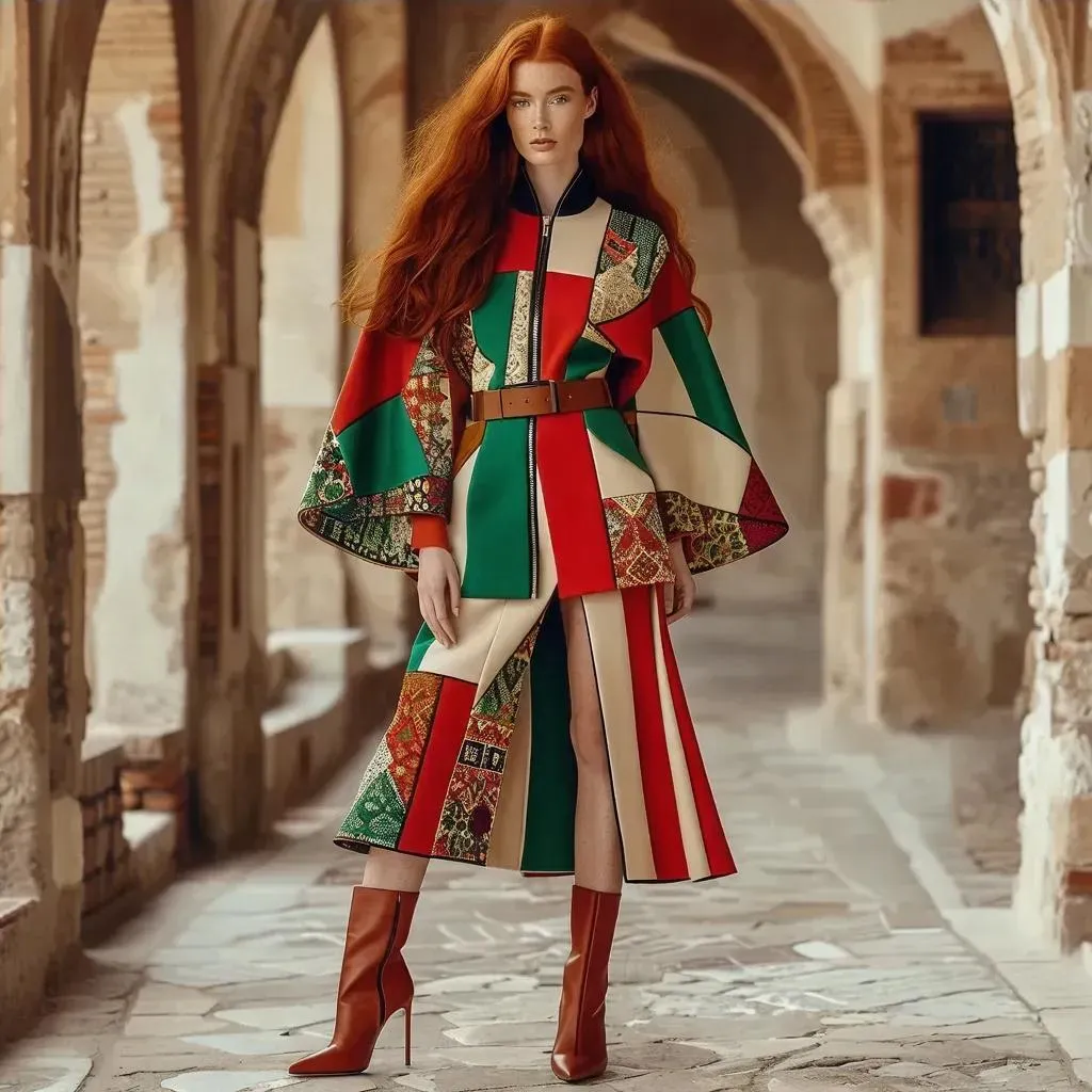 Explore AI-generated fashion design: Redhead woman in a spring-summer collection featuring red, beige, and green Ottoman patterns. Futuristic patchwork jacket with batwing sleeves, men's collar, and pockets. Striped zippered skirt, waist-hugging belt, and high-heeled shoes. Full-body AI image blending vintage motifs with modern style. Create professional-grade visuals with VivaGo.ai's creative tools.