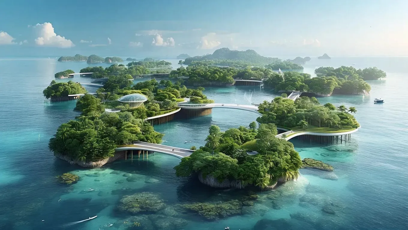 Explore a futuristic AI-powered sustainable island system from a bird's-eye view. Artificially connected green islands surrounded by desalinated waters feature an autonomous AI-operated port, zero pollution, and pristine cleanliness. Experience eco-friendly innovation with AI-generated visuals of advanced environmental management and waste-free technology.