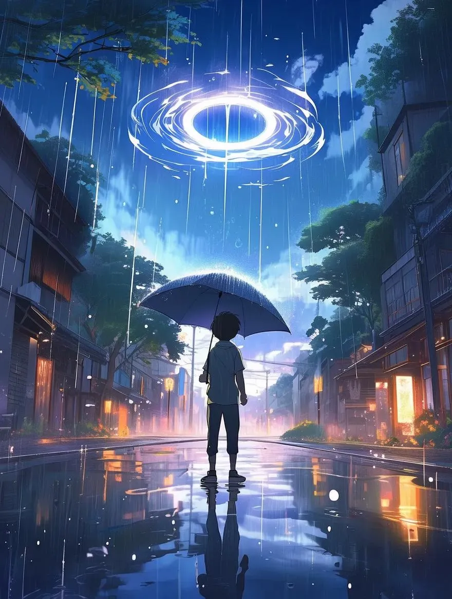 Craft hyper-detailed anime scenes with vivago.ai: Transform text into magical realism visuals of rainy cityscapes, parallel worlds, and glowing water rings. Inspired by Makoto Shinkai’s cinematic style, blending teal-violet hues, watercolor reflections, and ethereal storytelling. Generate eye-level cinematic angles for AI art that merges fantasy with hyper-realistic detail.