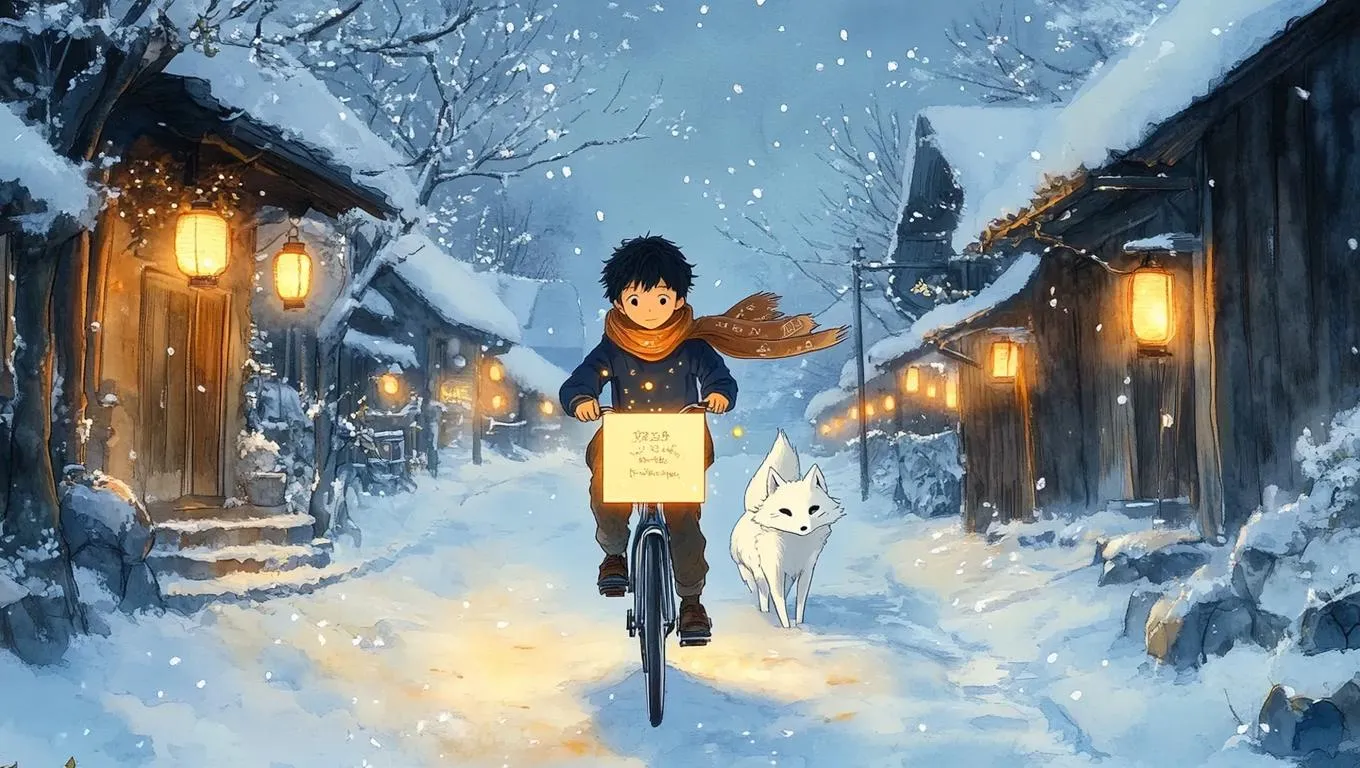 Create cinematic AI-generated anime art of a snowy village with a boy delivering glowing memory-letters. Rendered in soft Ghibli-style watercolor, featuring a white fox spirit, flickering lanterns, and enchanted melancholy. Pale gold highlights evoke dreamlike cyberpunk textures. Perfect for wistful, magical scenes.