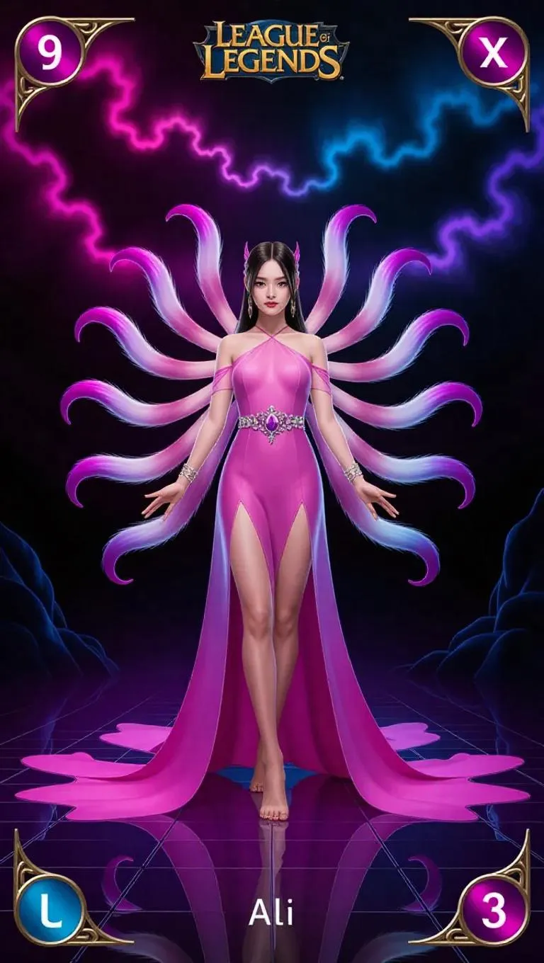 Surrealist League of Legends Ahri card art featuring spectral realms with mirrored floors and nebula skies. AI-generated nine-tailed fox with glowing gradient fur, translucent silk gown, and dynamic spirit flames. Octane-rendered CG masterpiece emphasizes ethereal lighting, flowing purple accents, and hyper-detailed textures. Perfect for mystical gaming visuals with vivid pinks, purples, and professional-grade 300dpi resolution.