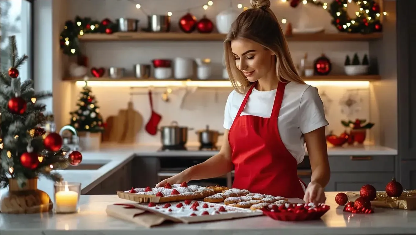 Explore AI-generated Christmas & Valentine's feast recipes in a modern kitchen scene. A young chef prepares festive dishes with elegant packaging, curated decor, and AI-enhanced culinary creativity for professional-grade holiday visuals. Blend festive flavors and contemporary design with AI-powered cooking inspiration.