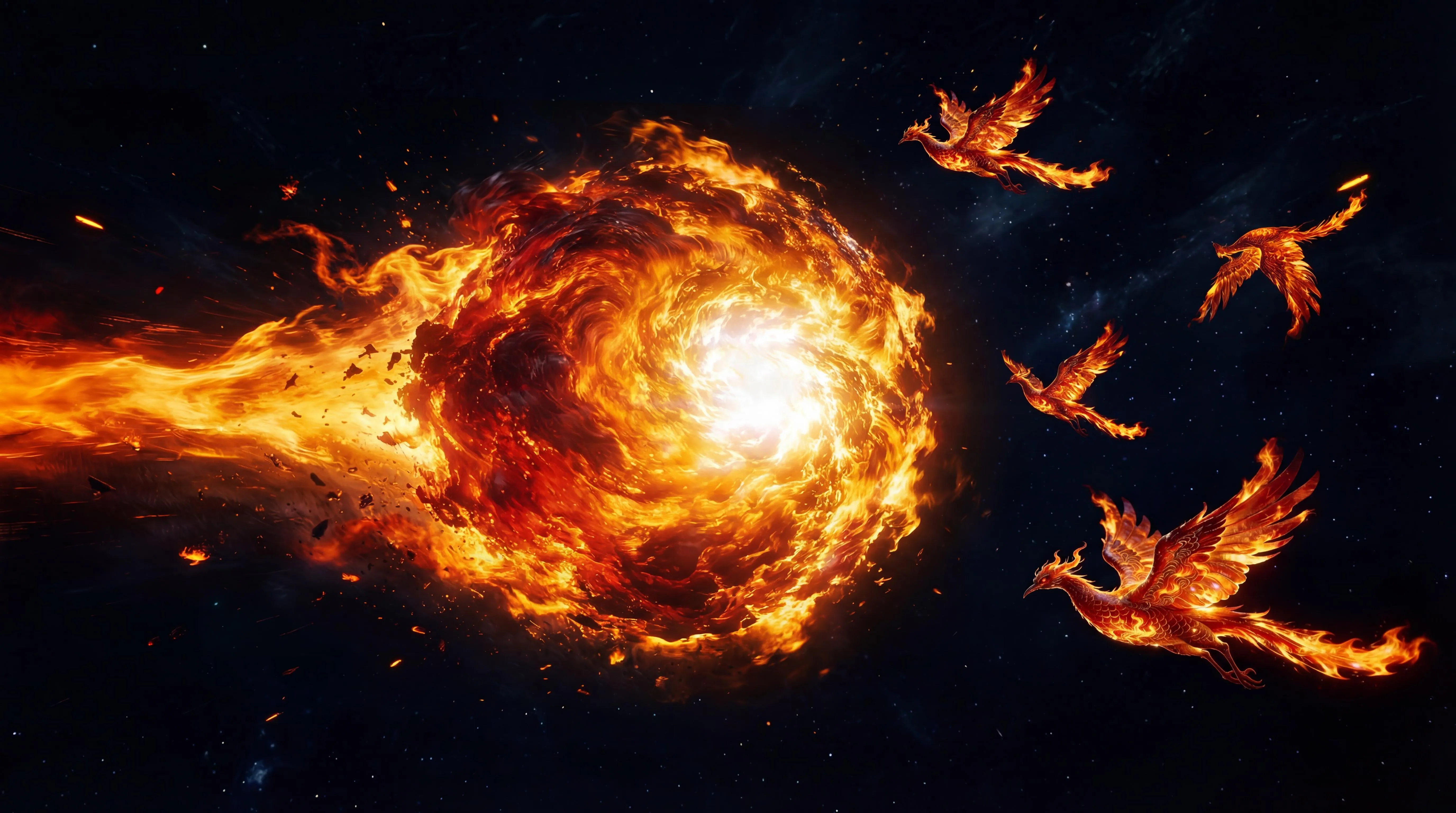 AI-generated night sky scene with trail-blazing fireball on the left and a dynamic flock of birds in pursuit on the right. Vivid, large-scale fire effect contrasts with small, varied bird silhouettes against the dark backdrop. Create this dramatic, AI-powered visual creation.