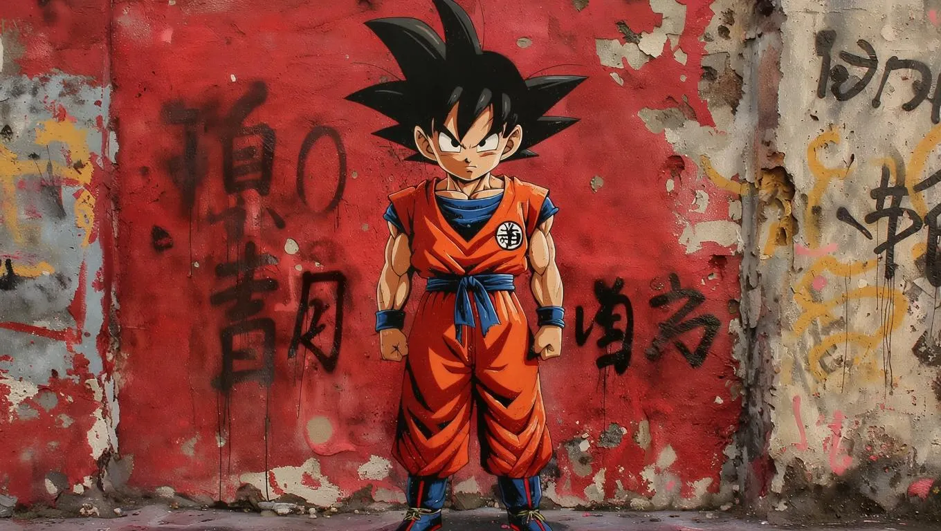 dragon ball, portrait of dr goku, full body, in the style of street art aesthetic, cute cartoonish designs, photo-realistic techniques, dark red, childhood arcadias, anime aesthetic, cartoon-like figures