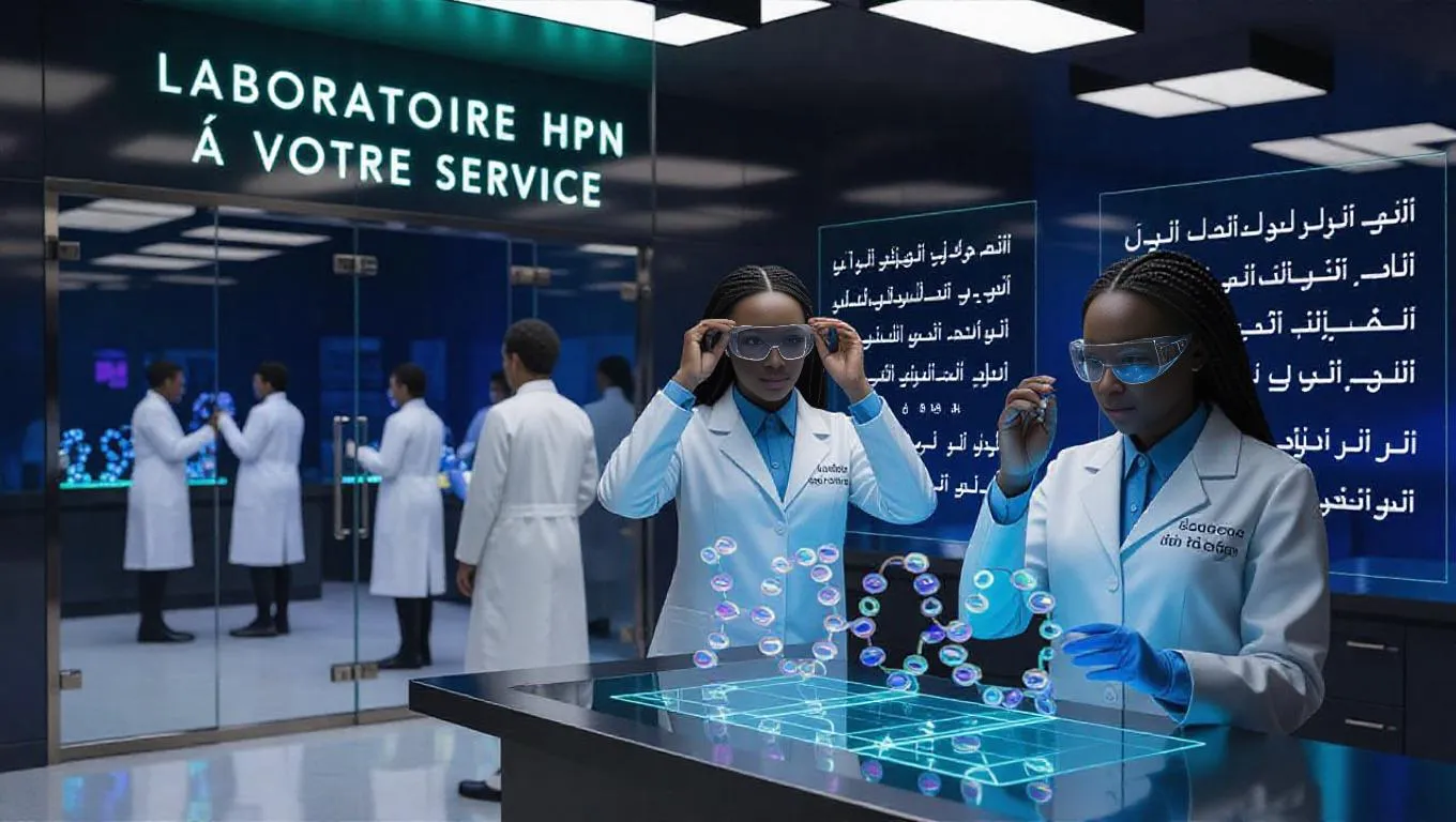 Futuristic medical laboratory with "LABORATOIRE HPN À VOTRE SERVICE" glowing in sleek turquoise holography above glass entrance doors. Black scientists in crisp white coats with melanin-rich skin tones analyze prismatic DNA models under crystalline lighting. One adjusts her protective goggles, revealing the lab’s motto embroidered in metallic thread on her sleeve. Holographic data panels cycle the phrase between French, Arabic, and Mandinka scripts. A young Black researcher with box braids projects 3D vaccine structures onto a transparent screen, the slogan pulsing gently in the background, letters dissolving into molecular chains. Panoramic windows showcase solar-powered drones delivering medical supplies to a vibrant Dakar neighborhood bathed in golden-hour light.