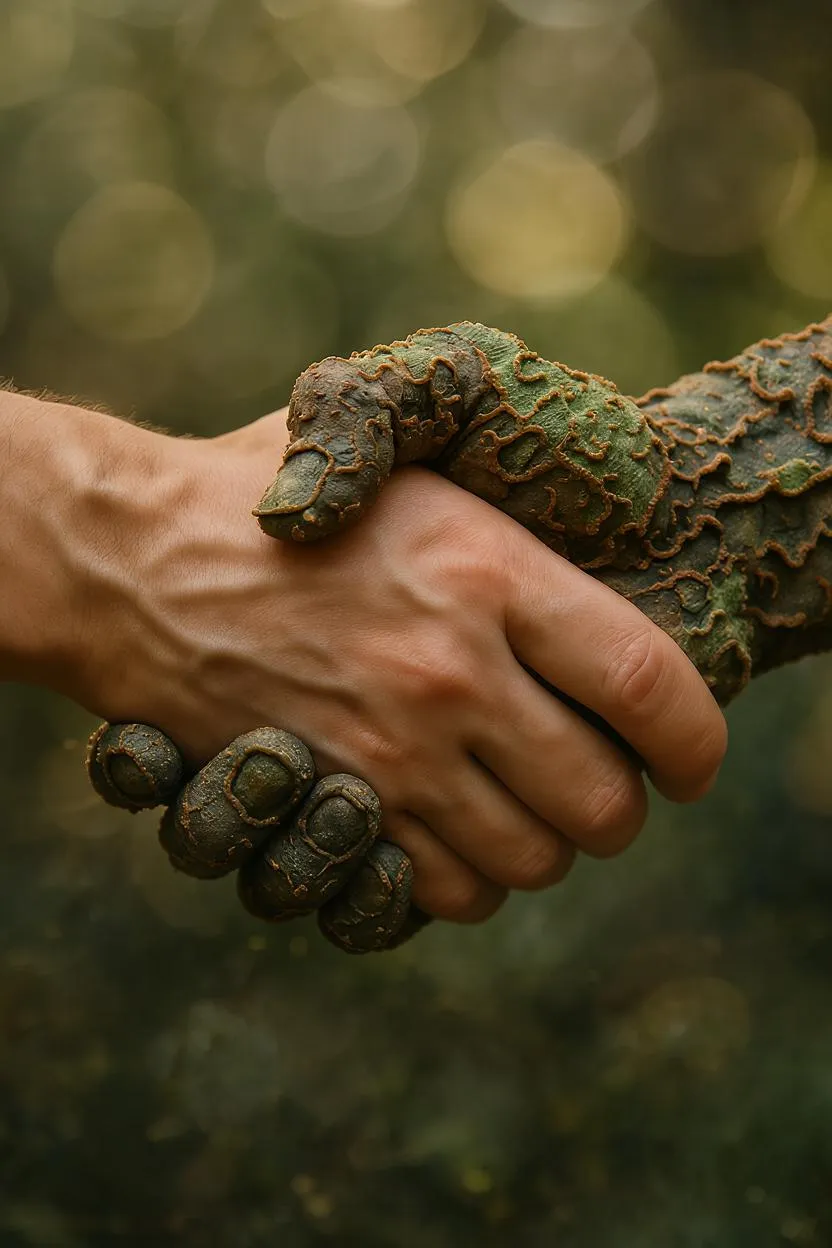 Hyper-realistic AI-generated image of human and Trichoderma harzianum fungal hands shaking. Organic textures—velvety mold, mycelium fibers, earthy tones—contrast smooth human skin. Natural lighting highlights symbiosis of decay and transformation. Striking blend of hyper-detailed biology and poetic surrealism, merging AI creativity with themes of nature's adaptability. Unsettling yet captivating visual storytelling for sci-fi, biology, or eco-art concepts.