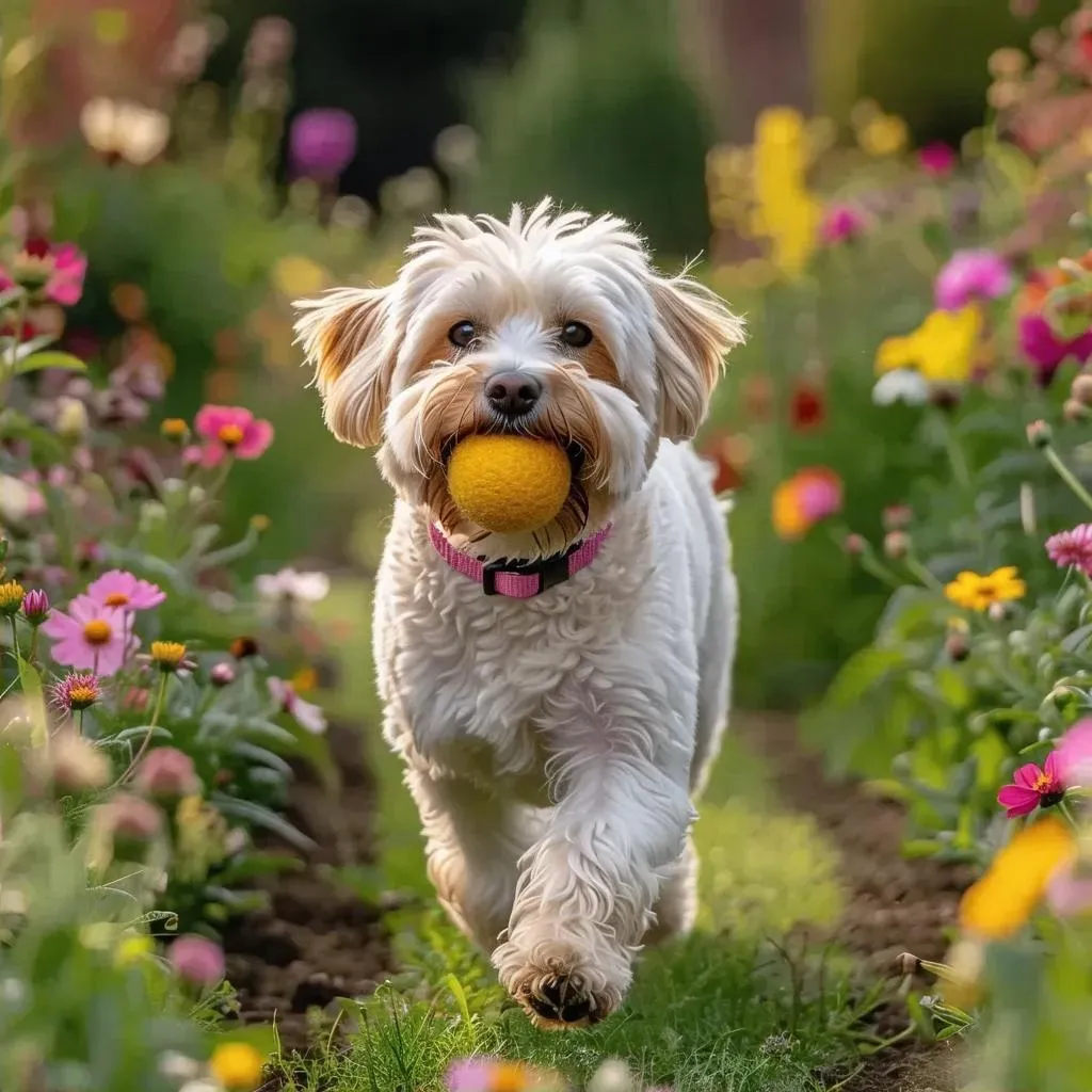 Create a charming AI-generated image of a playful white dog with a pink collar, holding a ball in its mouth while strolling through a lush garden. Perfect for pet lovers, this vivid AI artwork captures joyful moments with customizable details. Download now for free at VivaGo.ai.