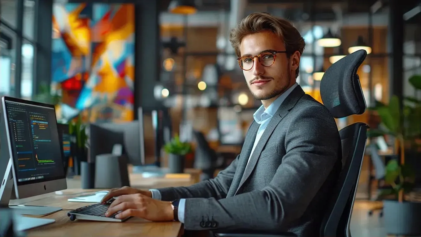 Create a professional AI-generated image of a young man in an office setting, seated at a desk with a computer screen. Front-facing camera view highlights focus and productivity. Ideal for modern workspace visuals. Optimize realism and AI image generation for websites, ads, or corporate content with VivaGo.ai's creative tools.