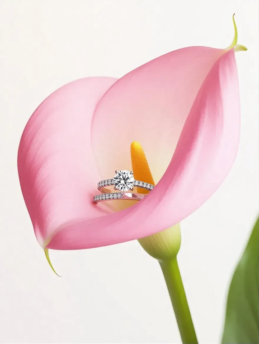 Craft ultra-realistic AI jewelry visuals with Vivago.ai. Generate high-end jewelry ad images: a close-up, macro photo of a pink calla lily stem adorned with luxurious diamond rings on a white background. Achieve hyper-realistic detail, soft natural lighting, and minimalist composition effortlessly. Use this creative AI tool for stunning, professional results.