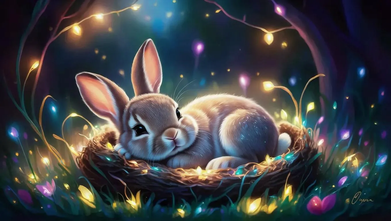 A luminous baby rabbit sleeps peacefully in a magical den surrounded by fluorescent twinkling lights and abstract color field gradients. AI-generated with vivago.ai's fluorescence effects and vivid color field painting techniques creates a whimsical nocturnal wonderland blending dreamy atmosphere with vibrant modern artistry.