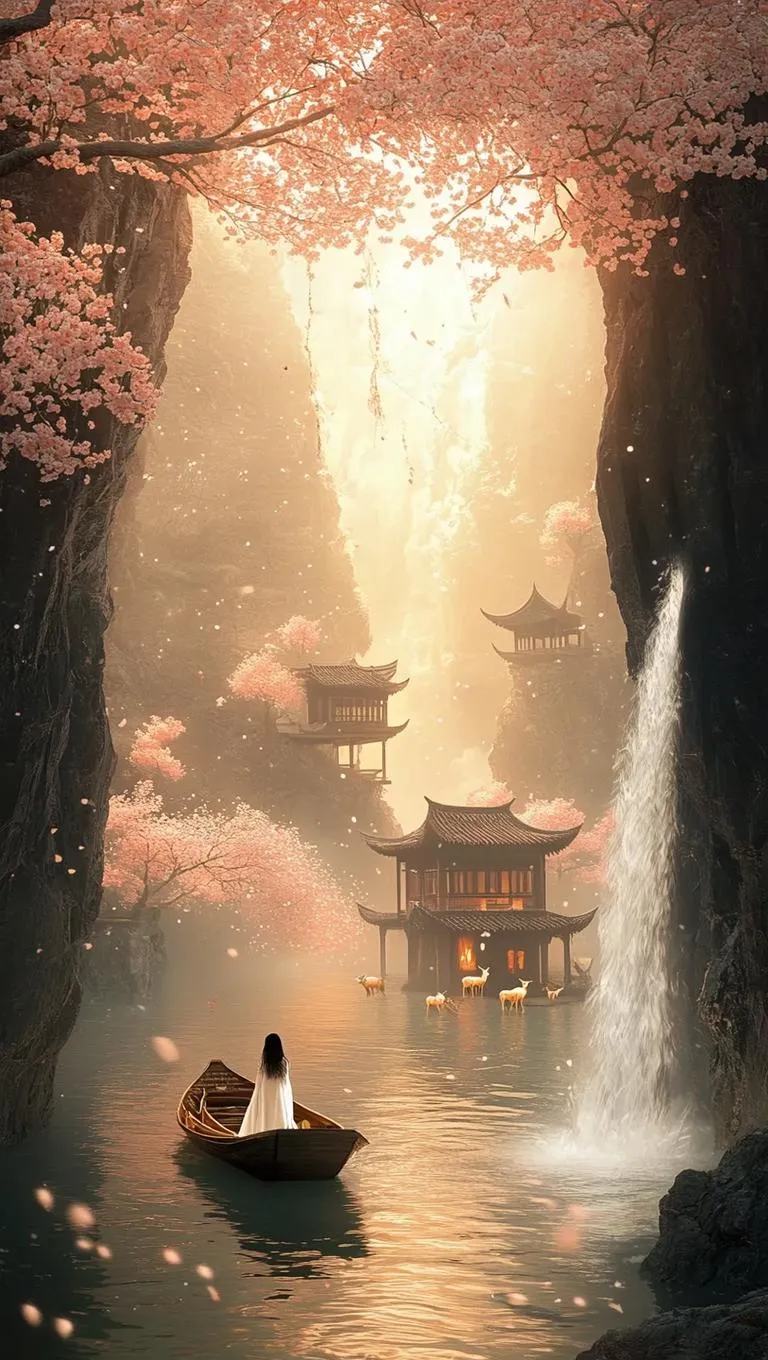 Discover a Chinese-style fantasy world where a boat glides through misty caves into an ethereal valley. AI-generated visuals transform text into dreamlike golden mists, floating houses, glowing peach blossoms, and curious figures from *The Peach Blossom Spring*. Craft viral-worthy scenes with Vivago.ai’s AI art tools—blending traditional motifs, surreal landscapes, and mystical storytelling in one click.