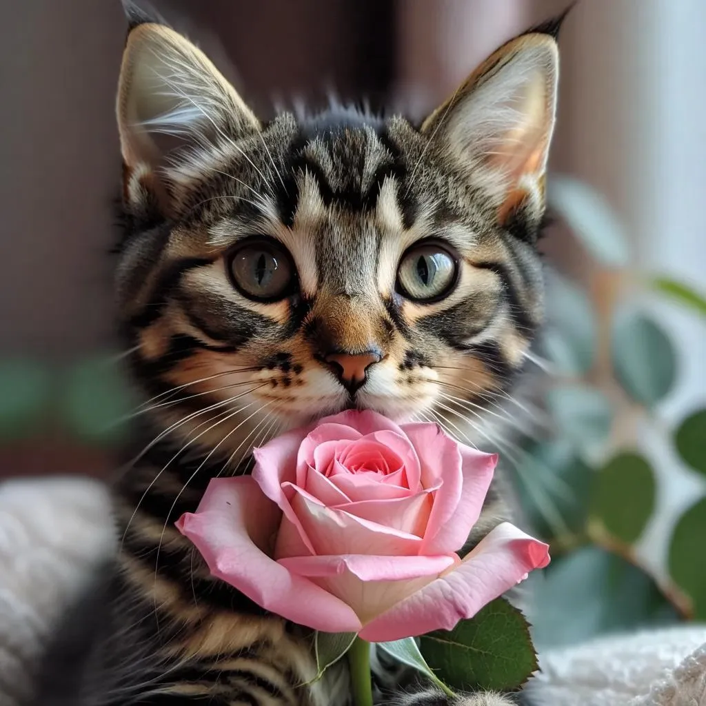 Transform your vision into AI art with this stunning image of a pretty cat holding a vibrant pink rose. Create lifelike, whimsical scenes using Vivago.ai's creative AI tools. Generate high-quality, detailed pet portraits and floral-themed artwork through advanced text-to-image technology. Perfect for animal lovers and digital artists.