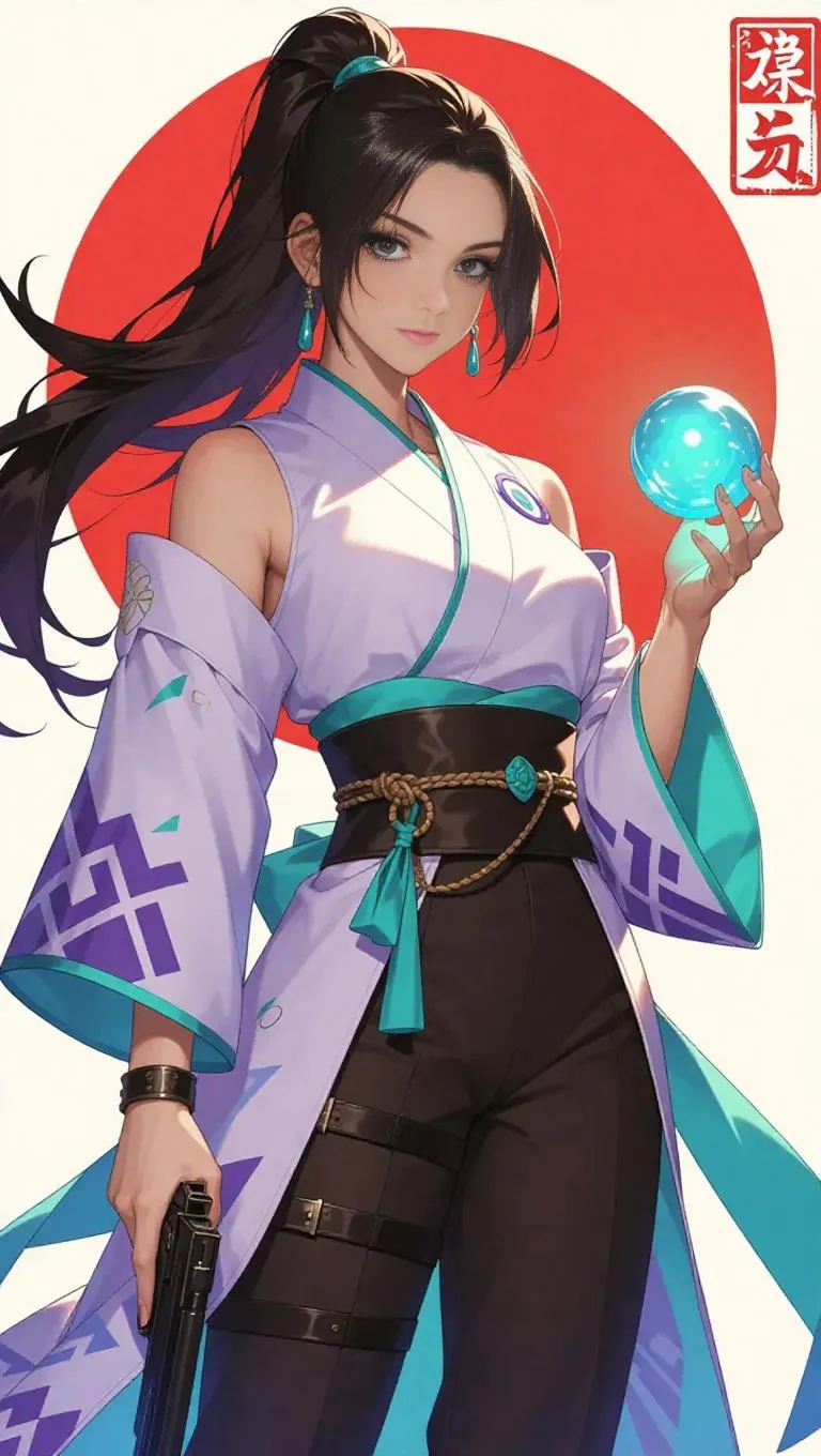Vibrant AI-generated Asian female character in traditional Japanese-style robe with teal accents, blending magic and modernity. Studio-style design features detailed fabric folds, armored pants, mystical orb, and confident stance. Realistic textures, dynamic teal-purple hues, geometric background. Perfect for fantasy art, character concept, or AI-generated anime inspiration. Explore mystical warrior aesthetics with cutting-edge AI creativity.