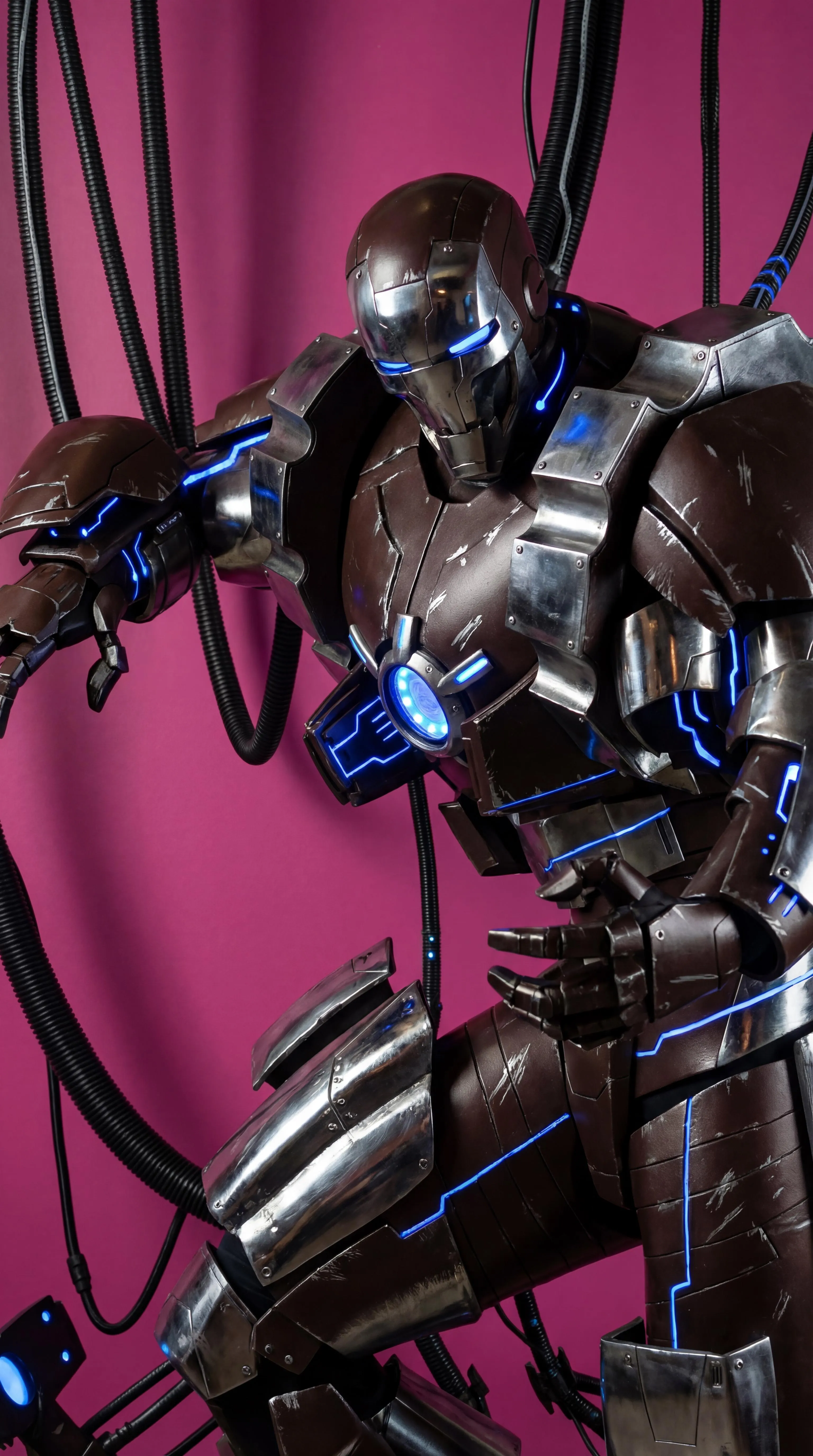C4D, a metallic paper toy box is completely wrapped in transparent plastic film. The box body has a large observation window to show the inside. A 3D cartoon-style robot dog doll is wearing metallic silver overalls with a neon green shirt, shiny chrome fur, a round face with big red eyes and robotic eyebrows, a blue visor and tech goggles, holding a circuit drink cup, and wearing digital shoes. The package contains two changeable visors and three pairs of futuristic shoes of different styles. The background features a high-tech toy store display stand in electric tones. The plastic packaging film reflects the ambient light, presenting a reflective texture. The overall picture is full of the technology of a collectible figurine.