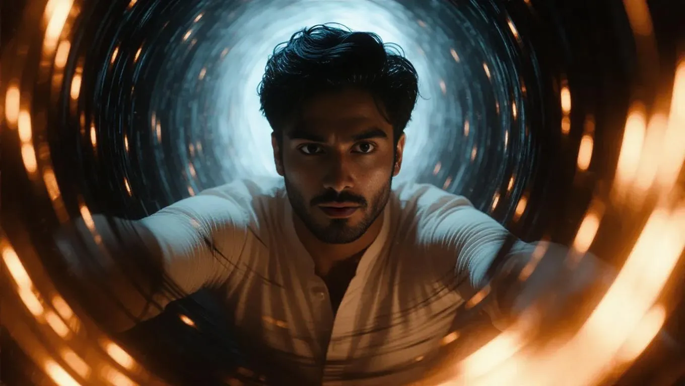AI-generated art captures Ayan, a young Indian man in a white kurta-pajama, engulfed by swirling dark energy. Dramatic mid-shot highlights his courageous expression, surreal slow-motion fall, and moody lighting. Blend of realistic and surreal styles amplifies the chaotic, mysterious atmosphere. Perfect for dynamic storytelling with AI effects.