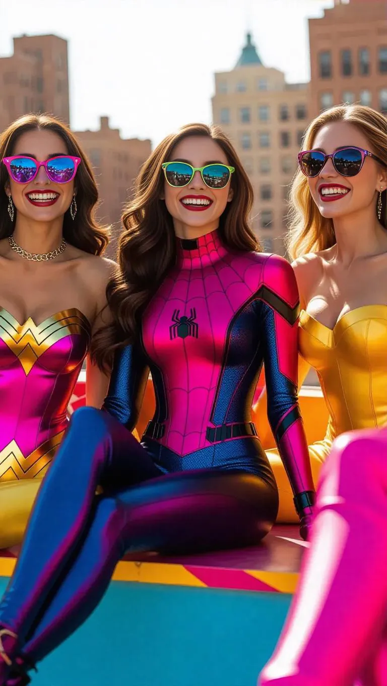 A playful and cheeky scene featuring Spider-Woman in a sleek, form-fitting suit, lounging casually with Wonder Woman and iconic Disney Princesses (Ariel, Belle, Rapunzel) on a vibrant rooftop. Bright, sunny day with bold, colorful decor. Group laughing, teasing, striking fun, confident poses, exuding a flirty, mischievous vibe. Stylish, modern outfits with sunglasses, boots, jackets. Bold, feminine, carefree atmosphere, blending superhero power with princess charm.