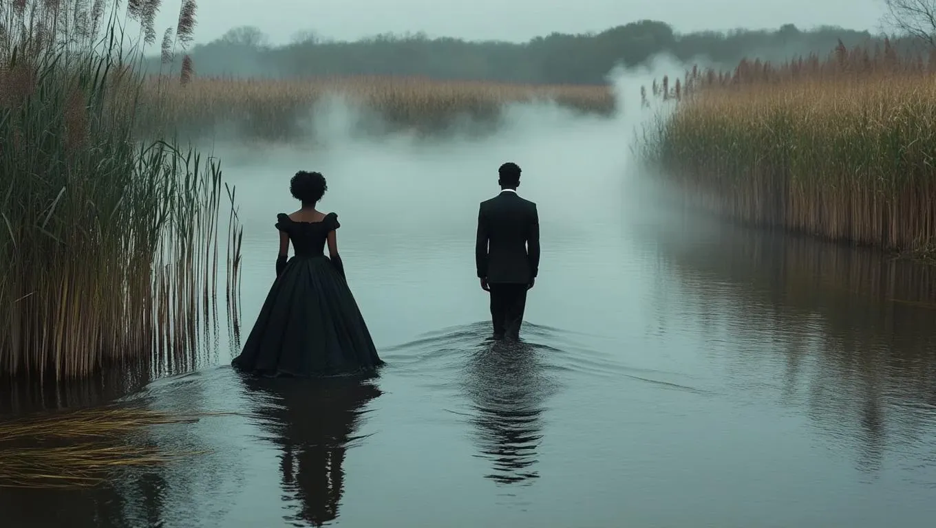 Craft haunting AI imagery of undertakers crossing a river, a grieving young woman in black beside a grave on one bank. Vividly depict the symbolic divide between life and death, blending dramatic visuals with emotional depth. Generate this evocative scene using AI-powered tools for symbolic storytelling and professional-grade visual impact.