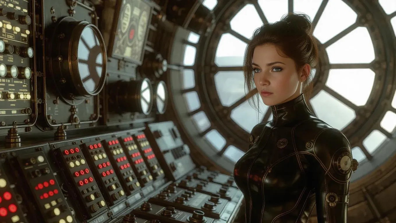 Immerse in a hyper-detailed Dieselpunk space station interior featuring a melancholic sci-fi cyborg woman by a retro switchboard. Rendered in 3D Octane with sharp focus, depth of field, and gritty textures, this AI-generated scene blends dieselpunk aesthetics, sci-fi fantasy, and intricate digital artistry for immersive storytelling or D&D-inspired visuals.