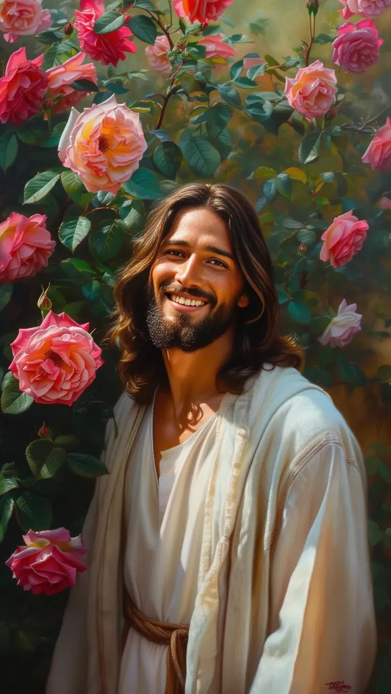 Create a hyper-realistic AI-generated image of Jesus with a youthful face and long hair, standing before a vibrant rose bush. Experience HDR-enhanced vivid textures, lifelike details, and serene expressions with Vivago.ai's advanced AI tools for professional-grade religious art and photorealistic spiritual visuals.