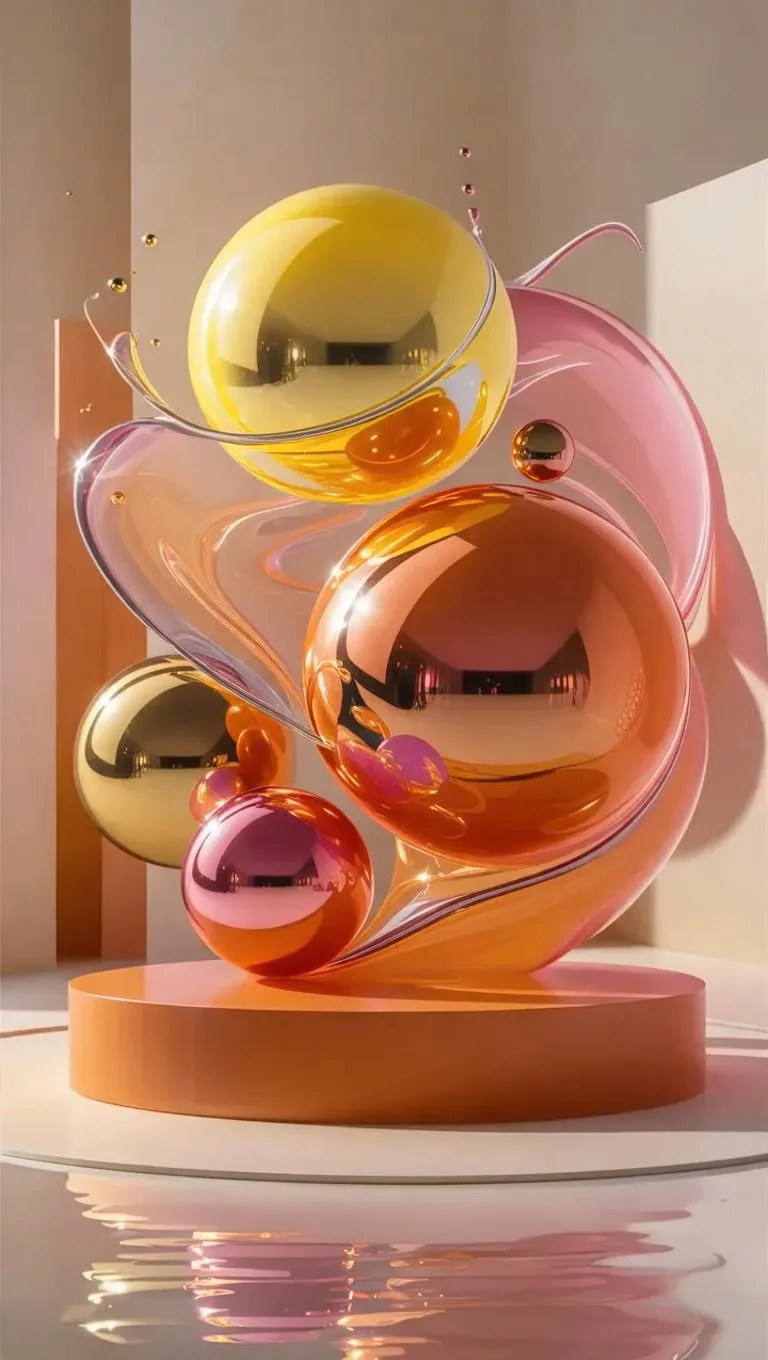 Generate vibrant AI abstract designs with glowing metallic spheres and dynamic translucent liquid in pink and orange hues. AI-powered tools create realistic lighting, soft shadows, and fluid motion effects on a minimalist beige backdrop. Contrasting orange base enhances visual depth for striking professional-grade digital art.