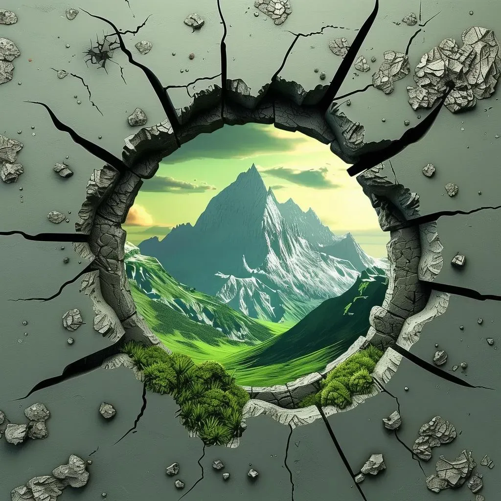 Generate AI-powered 3D retro-style art featuring a cracked circular wall portal leading to a vibrant mountain landscape with lush green valleys. Transform text prompts into nostalgic, immersive visuals using advanced AI tools for professional-grade creative results. Perfect for surreal digital art, game design, and retro-futuristic storytelling.
