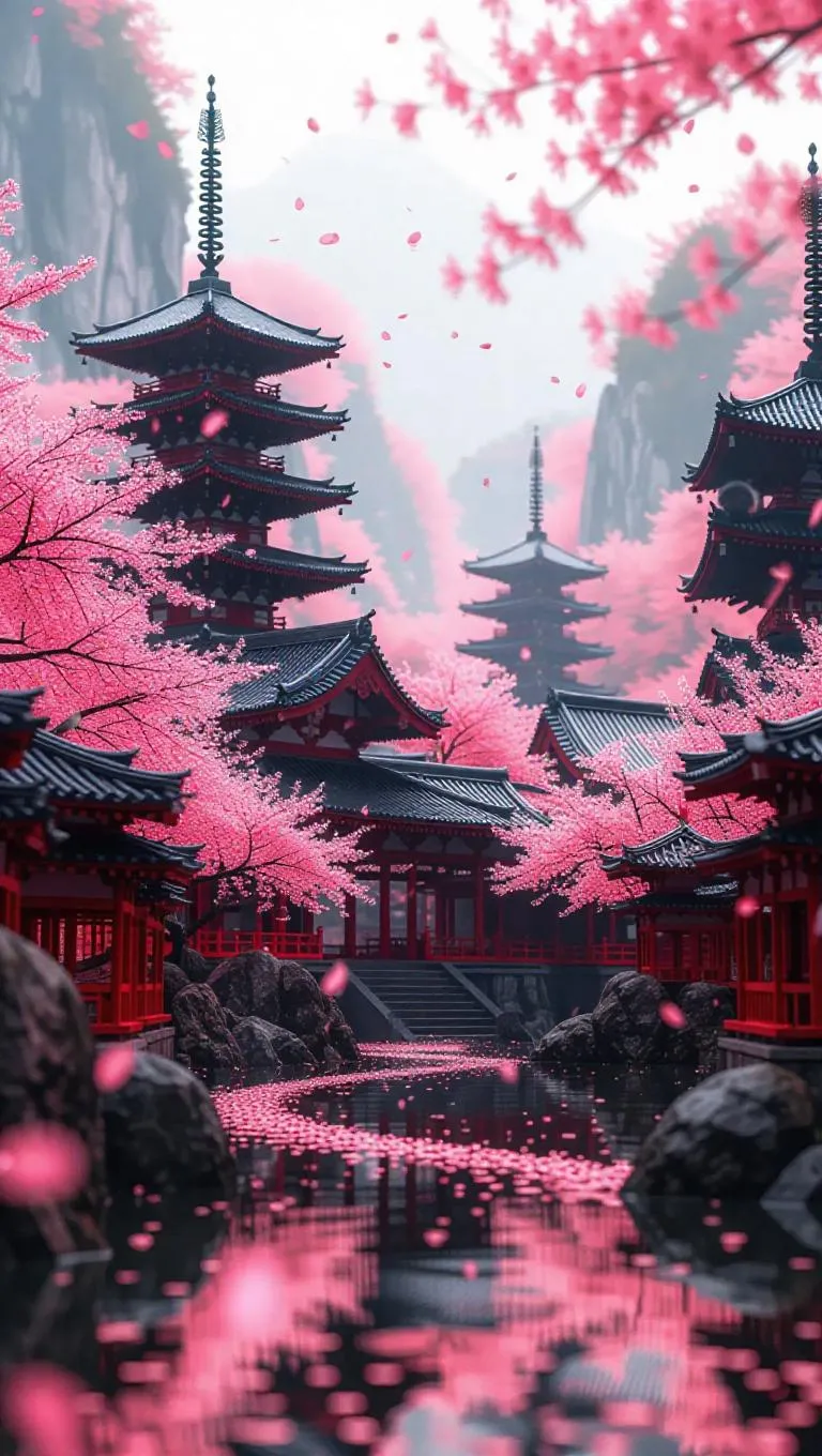 Immerse in surreal ancient Japanese architecture with AI-generated pink cherry blossoms in pastel hues. Hyperrealism meets mysticism in high-definition scroll art, blending vibrant reds, deep blacks, and ethereal grays. Transform prompts into vivid visions of Japan's ornate heritage using Vivago.ai's surreal effects.