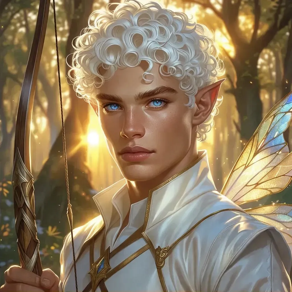 Create a stunning AI-generated medieval warrior fairy man with blue eyes, white curly hair, and a warrior bow. Perfect for fantasy art, this prompt crafts a sexy, detailed character in period suit armor. Transform text into vivid, professional-grade visuals with VivaGo.ai’s AI image generator for dynamic fantasy scenes and creative storytelling.