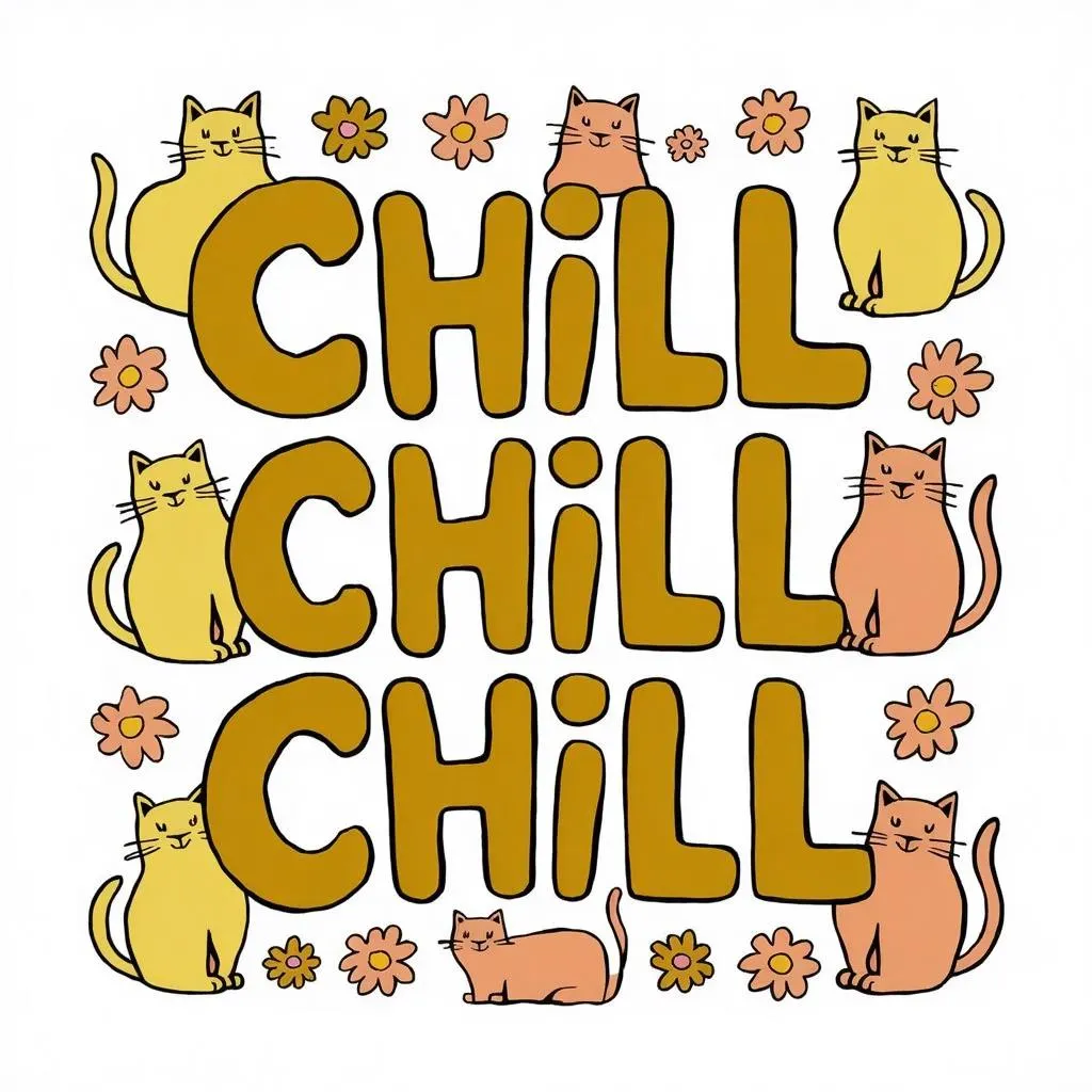 Create retro-inspired AI typography art with "CHILL CHILL CHILL" in playful hand-drawn letters, surrounded by pastel cats. This flower power design blends muted yellow-apricot hues, whimsical illustration, and conceptual typography on creamy white, evoking 60s vibes. Perfect for vibrant, timeless artwork merging nostalgic charm with modern AI-generated creativity.