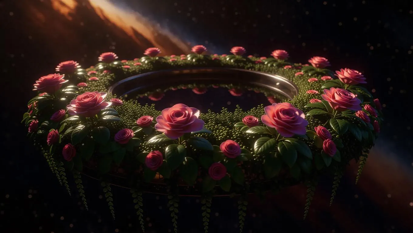 A floating garden on a comet’s tail, where flowers bloom from stardust and meteor fragments. Gravity-defying roses spiral around a black hole’s accretion disk, petals warping into intricate fractal patterns. Lichen-covered gardener robots prune supernova seedlings. Style: Chris Foss space art with Art Deco detailing, ethereal lighting, and cosmic hues.