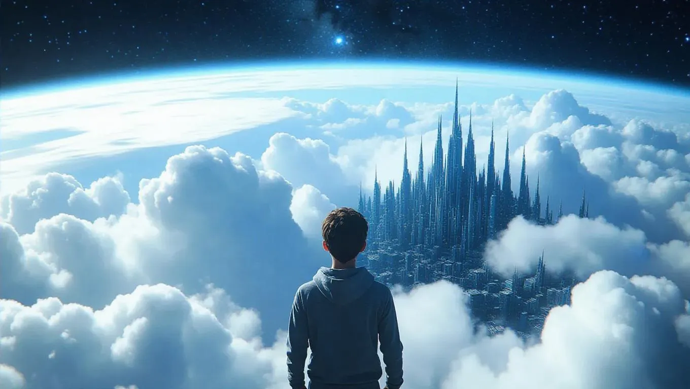Cloud City above and on clouds. Very high above ground, stars and outer space in background. Young person Looking over edge to see earth below from cloud City. Very distinct and elevated city realistic. Hyper realism