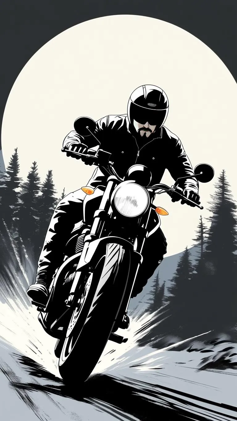 AI-generated hand-drawing style captures a thrilling motorcycle adventure: sleek black bike, rider in motion under a full moon, and mysterious forest backdrop. Perfect for dynamic visuals, artistic freedom, and nighttime storytelling. Create captivating, edgy scenes with vivago.ai’s AI effects for professional-grade, adventurous imagery.