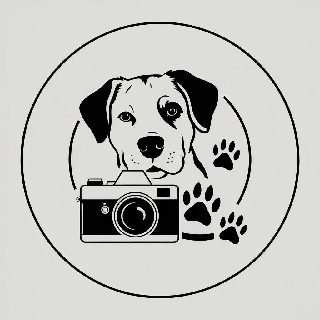 Create a minimalist vector logo with a round shape and outline style, combining dog, cat, camera, and pawprint elements in graphite black. Ideal for professional animal-themed branding, this basic design emphasizes simplicity and versatility for memorable identity.