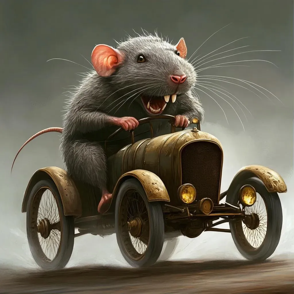 Generate a whimsical AI image of a giant rat driving a Bentley with VivaGO's creative tools. Transform quirky text prompts into surreal animal-art visuals and luxury car scenes. Explore AI effects for imaginative storytelling, professional digital art, and unique AI-powered content creation.