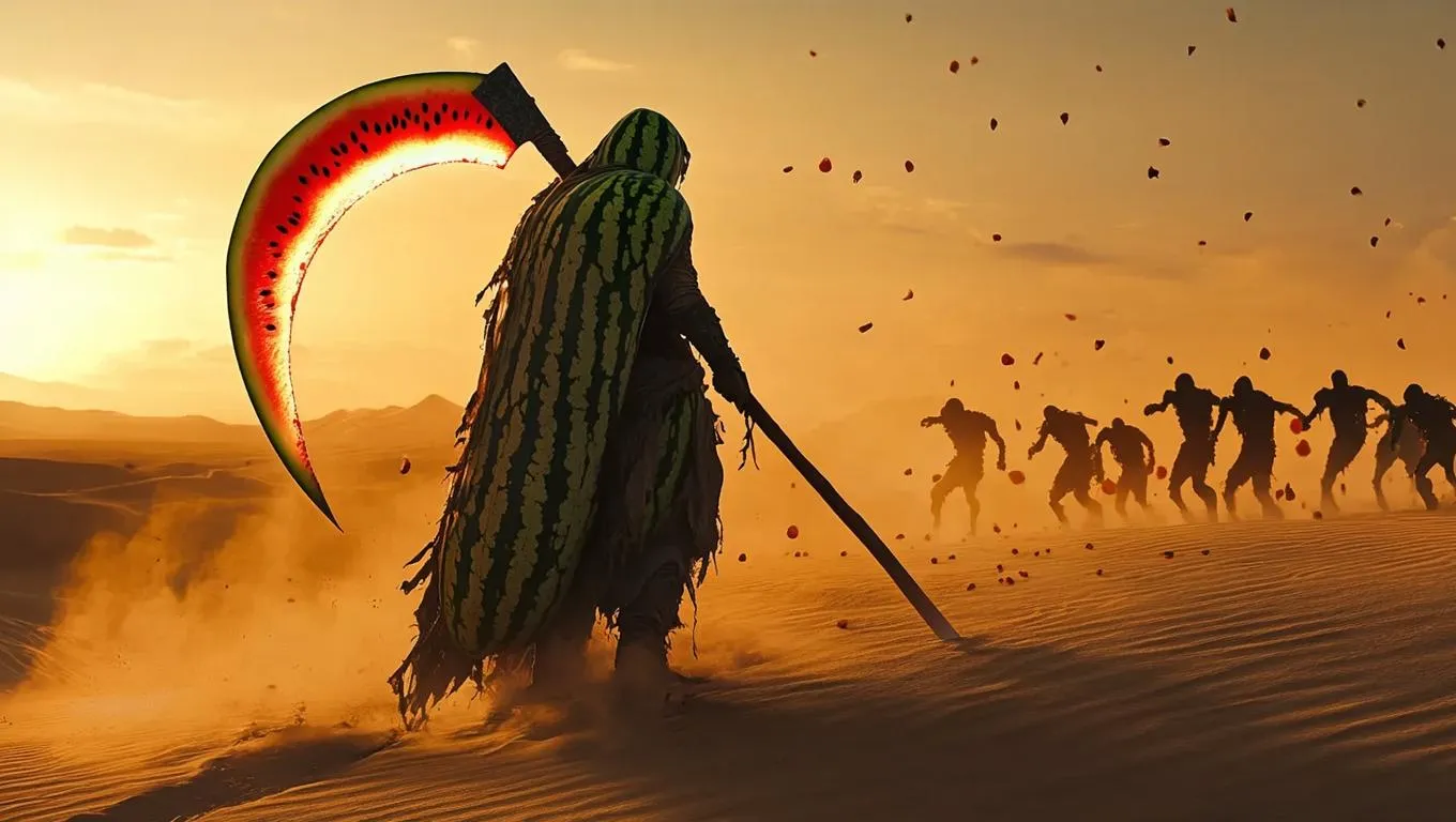 Epic AI-generated post-apocalyptic scene: lone warrior in watermelon rind robes wields a bioluminescent scythe against mutated strawberry beast riders. Cinematic desert battlefield at golden hour with hyper-realistic 8K detail. Stylized Mad Max meets samurai cinema – intense colors, dynamic lighting, ultra-detailed visuals. Create epic AI art with VivaGo.ai.
