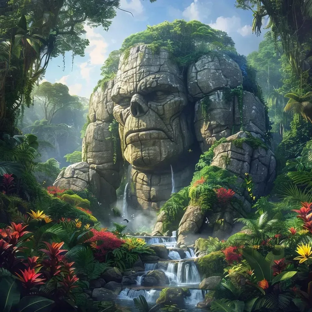 Explore a hyperrealistic panorama of a deceased colossal stone giant transformed into a mystic fantasy ecosystem. Vibrant rainforest flora clings to its form, while wildlife thrives in its crevices and gurgling streams. This surreal ink painting-inspired scene blends hyperrealism with medieval castle grandeur, merging nature's beauty with ancient remnants in a game-style, mystic fantasy panorama.