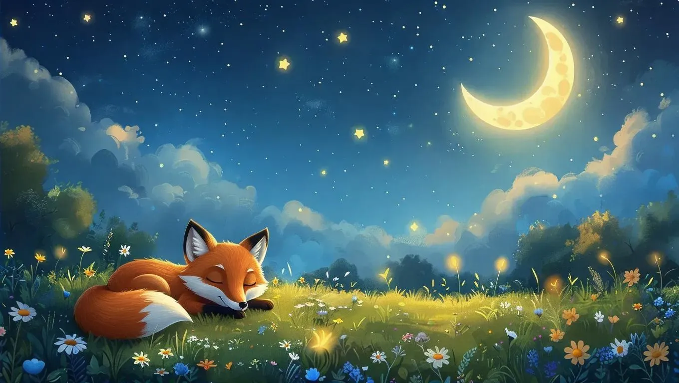 Create enchanting AI-generated line art bedtime scenes with magical meadows, glowing stars, and a friendly animated moon. Features sleepy foxes, colorful wildflowers, and floating fireflies under serene moonlight. Perfect for whimsical children's stories or peaceful nightscape designs using Vivago.ai's AI art tools.
