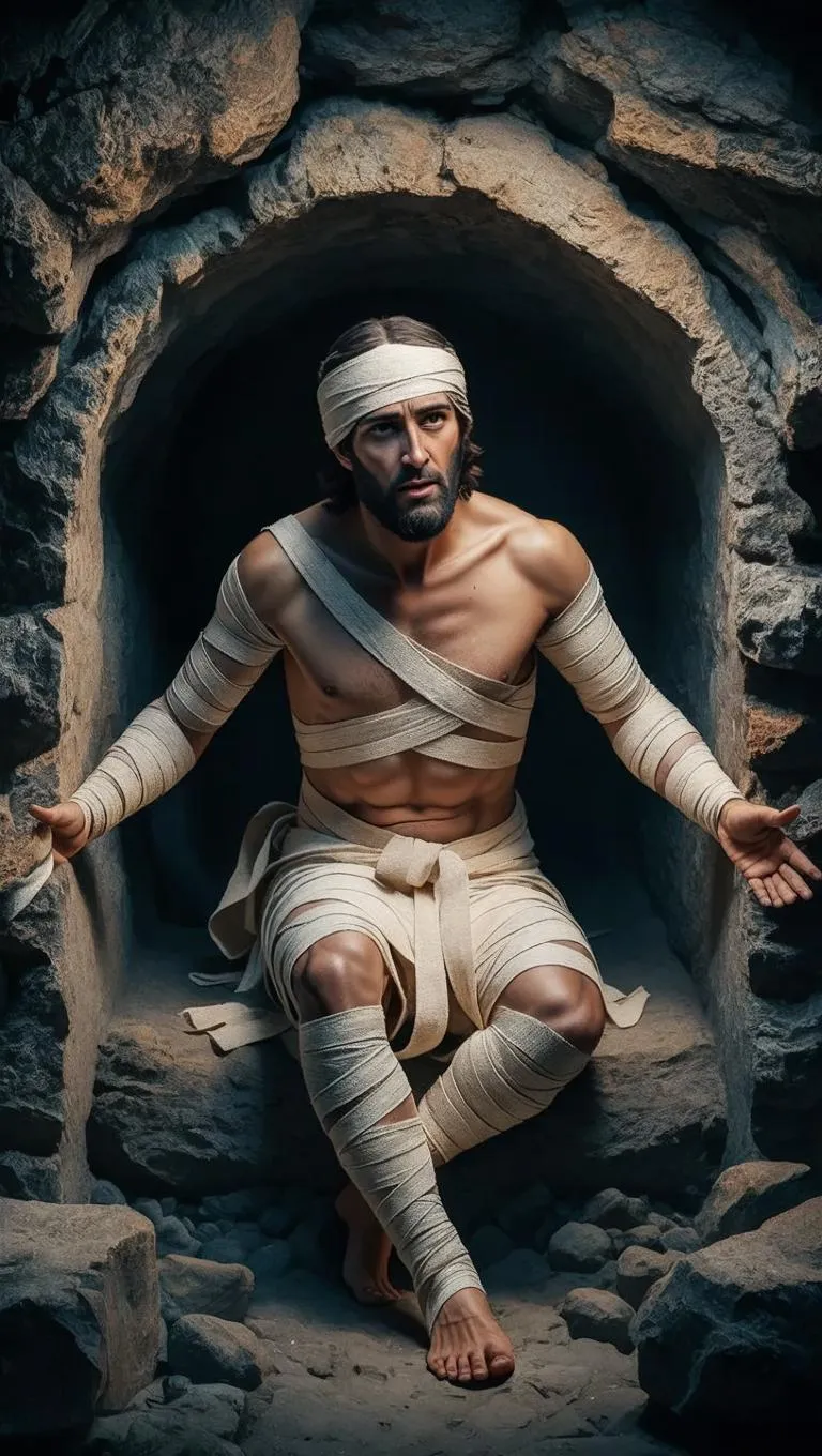 Experience the resurrection of Lazarus in stunning hyperrealism with this AI-generated image. Capturing the biblical figure emerging from the tomb, wrapped in ancient bandages, the scene combines dramatic lighting, intricate textures, and lifelike details. Transform text into vivid visuals using Vivago.ai's advanced AI tools for realistic religious art and dramatic historical recreations.