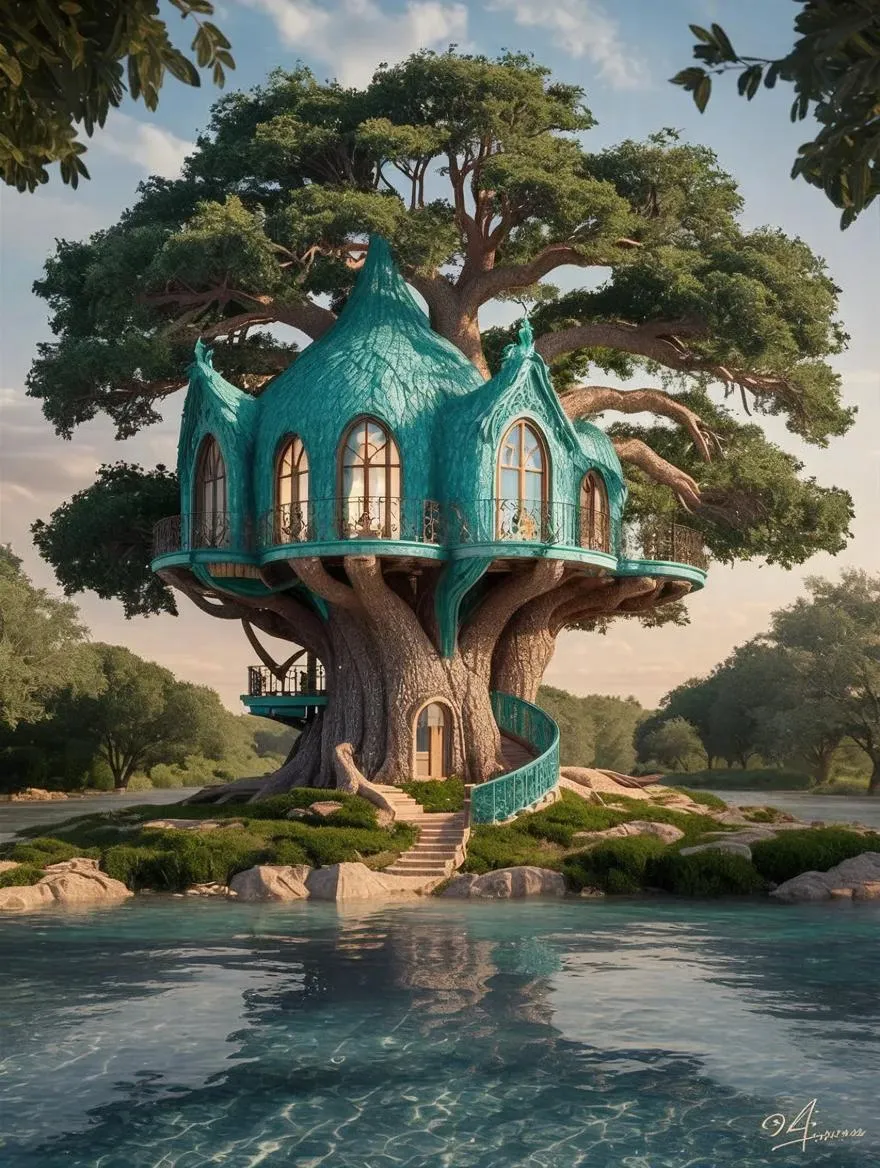 Discover an intricate tree-house nestled in a turquoise Angel Oak by a crystal-clear river. This AI-generated professional architecture render boasts photo-realistic 3D details, accurate dimensions, and multiple angles. Elevate designs with high-quality, award-winning visuals powered by vivago.ai—perfect for realistic materials, perspective views, and stunning AI effects. Transform concepts into lifelike creations effortlessly.
