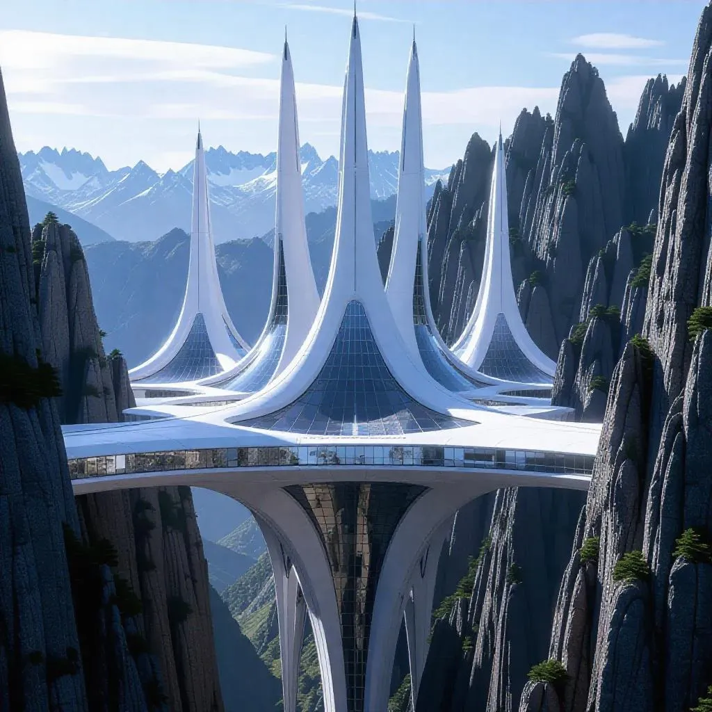 Discover AI-generated futuristic architecture blending high-tech design with rugged mountain landscapes. This visionary structure features sleek vertical towers, glass facades reflecting skies, and terraced platforms harmonizing technology and nature. Create your own sci-fi inspired mountainscapes with vivago.ai's advanced AI image generator.